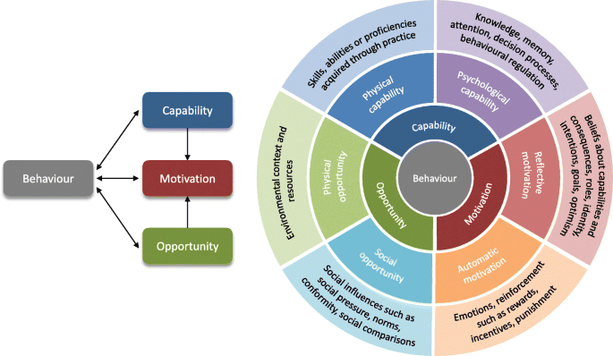 Mô hình COM-B là mô hình hành vi được sử dụng để thúc đẩy các biện pháp can thiệp hành vi (West và cộng sự, 2020) và dựa trên đánh giá ba yếu tố: Năng lực, Cơ hội và Động lực. Năng lực đề cập đến các thuộc tính cá nhân, hoặc tâm lý (như hiểu biết và trí nhớ) hoặc thể chất (như sự khéo léo), khi kết hợp với Cơ hội, có thể dẫn đến thay đổi hành vi hoặc ít nhất là tạo điều kiện thuận lợi cho việc đó. Cơ hội đề cập đến các thuộc tính vật chất (như nguồn lực vật chất và tài chính) và các thuộc tính xã hội (như chuẩn mực văn hóa và xã hội) của môi trường, có thể tạo điều kiện thuận lợi cho việc thay đổi hành vi. Động lực đề cập đến các quá trình tinh thần có thể thúc đẩy và định hướng hành vi. Nó có thể là phản xạ (quá trình suy nghĩ có ý thức) hoặc tự động (quá trình suy nghĩ theo thói quen) (vòng tròn bên trong ở Hình 1) (Michie et al., 2011). Trong phiên bản cải tiến của mô hình COM-B, Bánh xe Thay đổi Hành vi đã được phát triển thông qua đánh giá có hệ thống và tư vấn chuyên gia, theo đó chín chức năng can thiệp đã được xác định (vòng tròn ngoài cùng ở Hình 2) (Michie et al. , 2011). Điều này đảm bảo rằng các biện pháp can thiệp hành vi sẽ điều hướng các lựa chọn chính sách một cách thiết thực. Chín chức năng can thiệp bao gồm việc cung cấp thông tin và dạy các kỹ năng mới (Giáo dục), sử dụng thuyết phục và khuyến khích để thúc đẩy thay đổi hành vi (Thuyết phục), sử dụng phần thưởng hoặc các biện pháp khuyến khích khác (Khuyến khích), sử dụng các quy tắc và hình phạt để ngăn cản một số hành vi nhất định (Ép buộc), cung cấp thực hành và hướng dẫn thực hành (Đào tạo), giới hạn các lựa chọn để điều khiển hành vi theo hướng mong muốn (Hạn chế), thay đổi các yếu tố trong môi trường nơi hành vi diễn ra để tạo điều kiện thuận lợi cho hành vi đó (Tái cấu trúc môi trường) , cung cấp các ví dụ về hành vi mong muốn (Mô hình hóa) và cuối cùng là cung cấp các nguồn lực và hỗ trợ để biến hành vi đó thành hiện thực (Michie và cộng sự, 2011).
